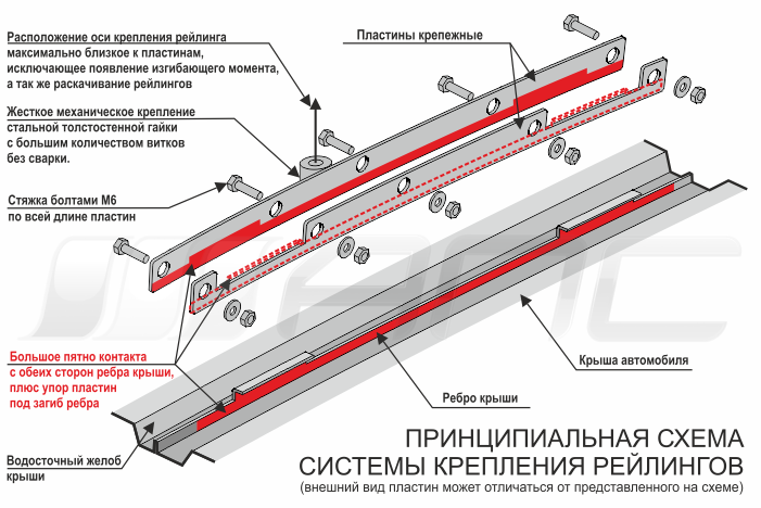 Способ установки рейлингов – Механическое крепление БЕЗ СВЕРЛЕНИЯ КРЫШИ! Для крепления рейлинга, под молдинги водостоков крыши устанавливаются крепежные пластины, которые надежно фиксируются к металлическому монтажному ребру автомобиля. Пластины полностью скрываются под молдингами в которых выполняются отверстия, по два с каждой стороны. Через полученные отверстия в молдингах Рейлинги прикручиваются винтами М6 в резьбу монтажных пластин